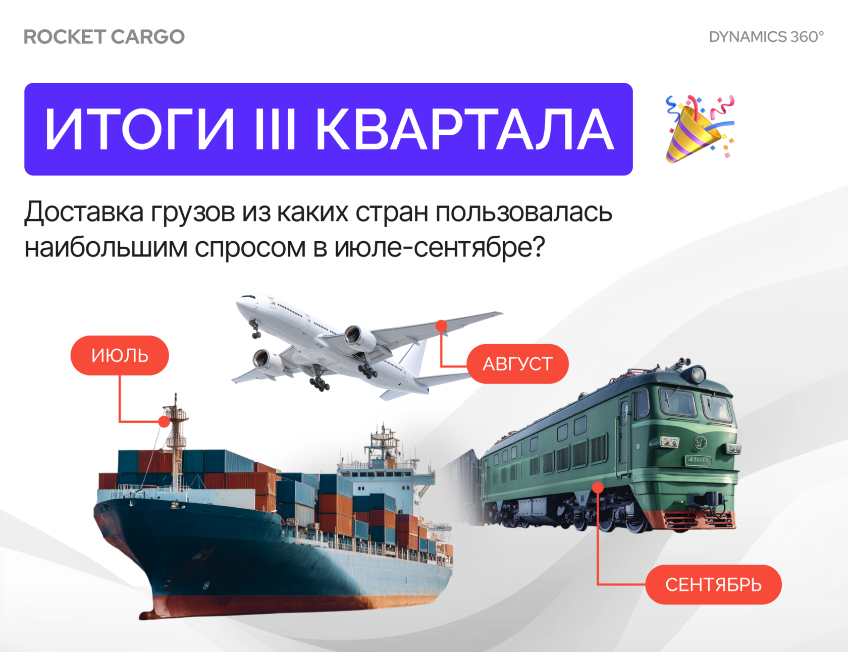По итогам III квартала компания Rocket Cargo выявила, что наибольшим спросом пользовалась доставка грузов из Китая, ряда стран ЕС (Германия, Италия, Нидерланды, Франция, Польша, Испания, Швейцария), Южной Кореи, ОАЭ, США. Кроме того, мы получали заявки на организацию перевозок из Новой Зеландии, Индии и Колумбии.